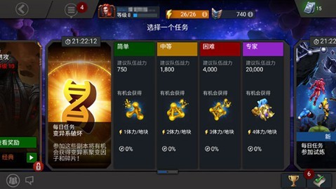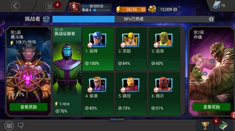 战役任务即是剧情的探索任务。终极目标是为了阻止征服者康,所以玩家从一开始会经常进入游戏剧情中与康进行对话。游戏中战役包含了6大幕,每一幕都有若干章节,章节下又细分了很多剧情关卡,这时候就需要玩家前往漫威宇宙中探索战斗了。玩家可以通过挑战战役任务解锁成就、升级、获得黄金和强化材料等必需品。新手建议可进行战役挑战一边体验剧情一边战斗哦~