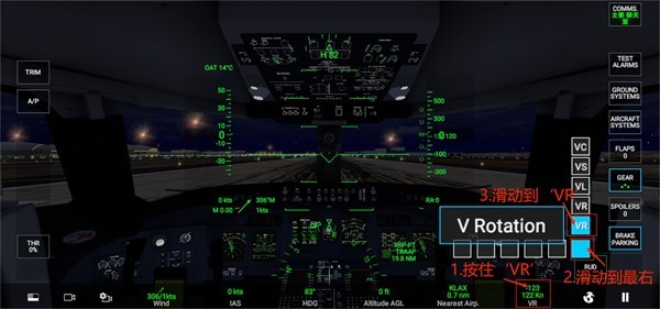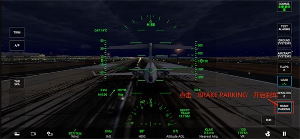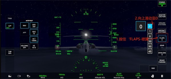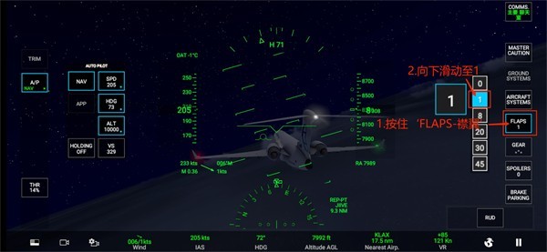2、按住‘FLAPS-襟翼’向下滑动至1