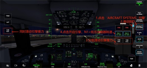 5、点击‘AIRCRAFT SYSTEMS-引擎’,滑动到E,滑动引擎推力,点击开启引擎,N1=低压压缩器转速