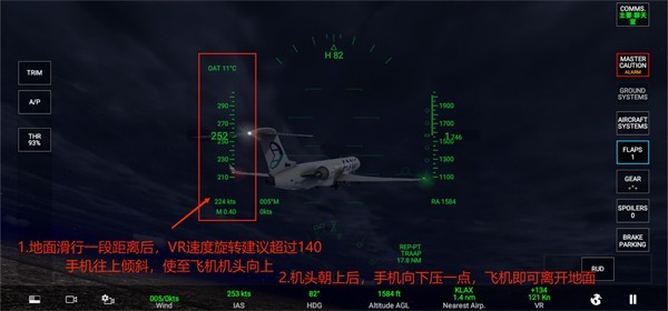 7、飞机在地面滑行一段距离后,留意VR速度旋转建议超过140后,手机往上倾斜,使至飞机机头向上,机头朝上后,手机向下压一点,飞机即可离开地面