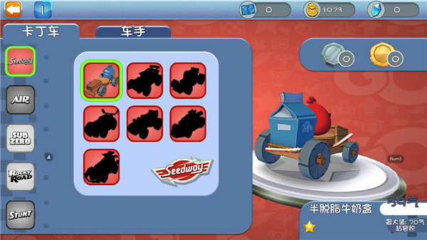 5、在卡丁车界面,玩家们可以选择并解锁自己喜欢的卡丁车和角色。