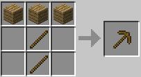 1、镐。镐的制作材料为木板、圆石、铁锭、金锭或钻石。镐可以用来挖掘方块以及其他资源。