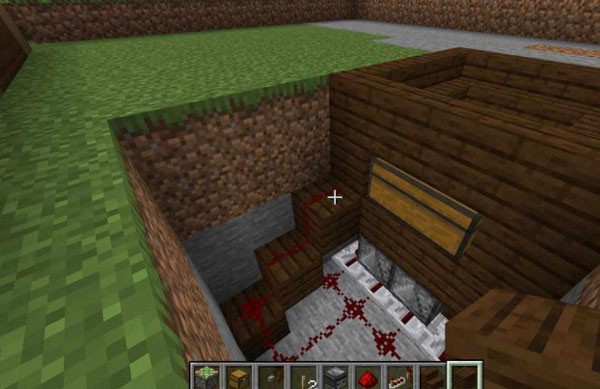 6、最后我们再铺放木板进行隐藏,再摆好1个按钮就做好我们的地板机关啦。