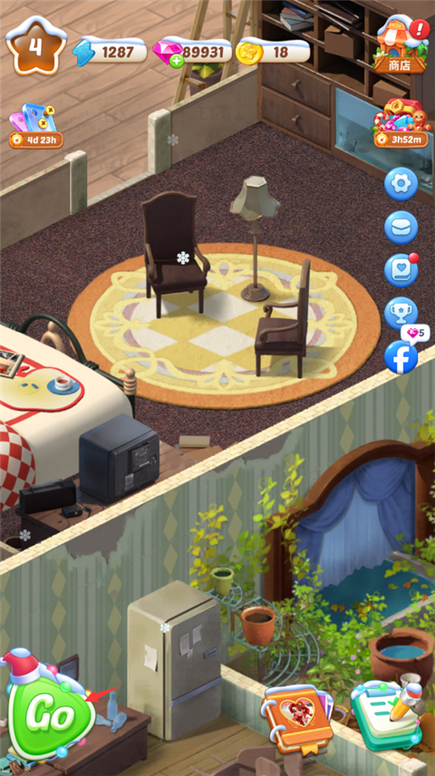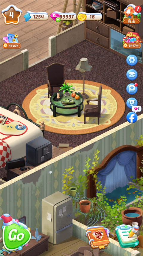 奥卡拉逃生游戏里集家园装修建设和合成消除玩法相结合,玩家需要通过完成更多的消除合成任务,去获得更多的道具和各种不同的家具,将房间设计成你喜欢的样子。