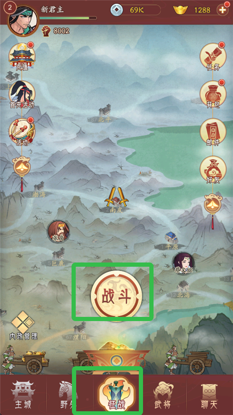 1、进入游戏,点击征战开始战斗。