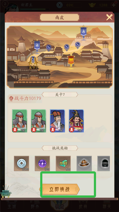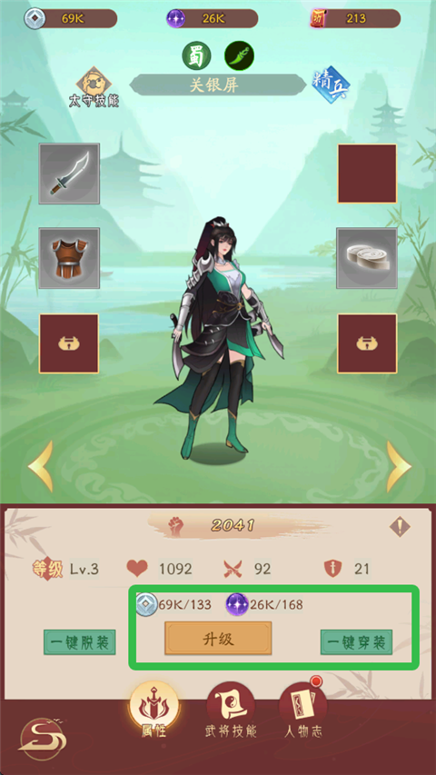 4、在武将界面点击武将进行升级,并穿戴装备,提升战斗力。