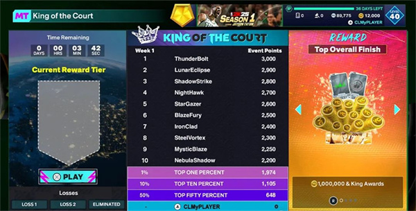 球场之王是一项自9月14日起太平洋时间每星期六上午10点至下午2点举行的独家活动。要获得参与资格,你必须在前一周的Showdown模式或三威胁公园模式中达到一定的等级,或者通过提升声望等级来自动获得资格。