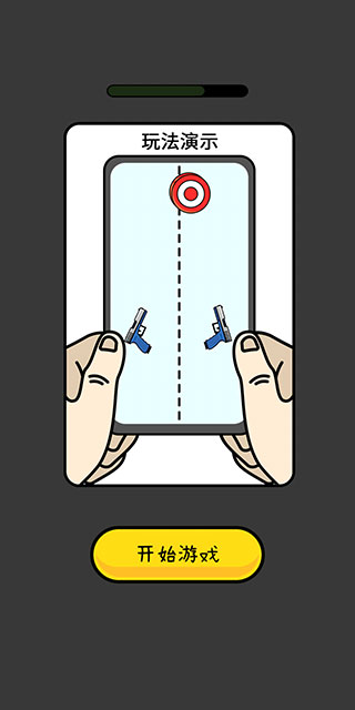 1、游戏的玩法非常简单,左右两侧各有一支枪,目标会从下往上出现,其运动轨迹就是屏幕中央的虚线。
