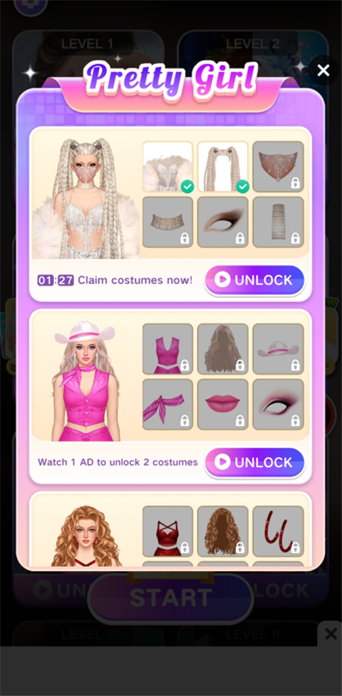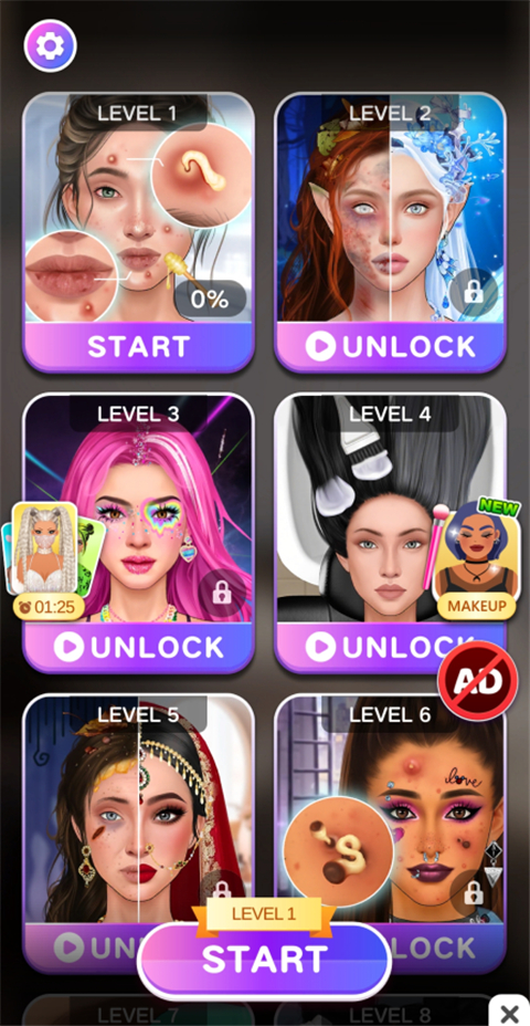 1、在本站下载安装尤雅美妆改造乐园游戏,打开进入游戏界面玩家可以看见大量关卡,点击START进行挑战。