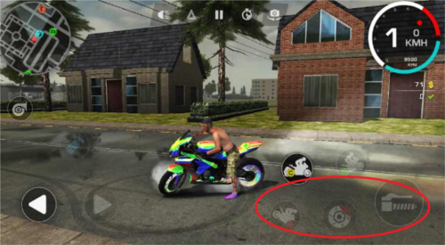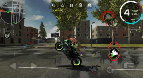 屏幕右边第二个动作是摩托车头翘起来,和驾驶一起按就是车头翘起前进的特技;