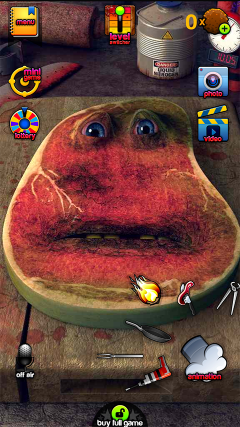 1、右下角设计了众多的煎制牛排的道具,点击不同的道具会对牛排造成相对应的伤口,牛排也会展现不同的表情。