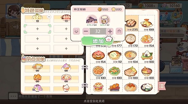 2、前期可以先解锁基础菜品,保证翻台率和现金流;随着进度推进,逐步研发稀有食材的高端料理,打造成餐厅招牌,提高评分和收入