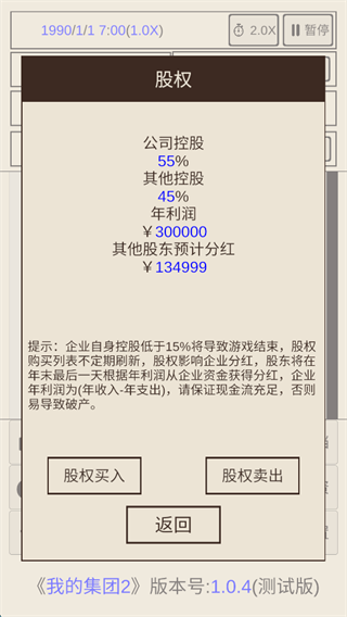 我的集团2游戏的整体操作玩法还是比较简单有趣的,还提供了全新的股权玩法模式,纯文字的叙述方式,完整呈现了一个企业发展的全过程,将带给你不一样的经商体验。