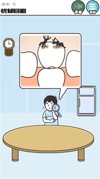 从时钟上得到放大镜,点击蛀牙下面的新牙,再点击蛀牙让它掉下来。