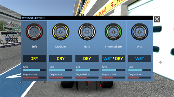 2、可以选择游戏开始的轮胎类型,天气,圈数等等,随后点击“CONITNUE”。