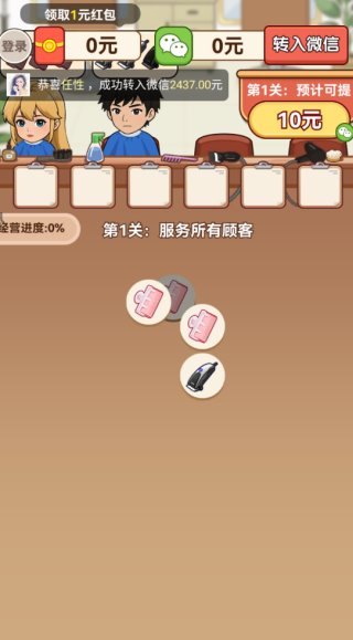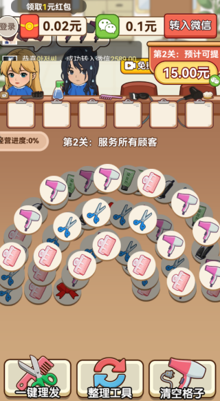 招财理发店是一款融合三消益智与模拟经营的休闲手游,玩家将化身理发店老板,通过消除玩法满足顾客的美发需求。游戏核心为经典三消机制,需在规定时间内匹配剪刀、梳子等相同工具完成消除,为头顶需求清单的顾客提供服务。随着关卡推进,可积累游戏币升级店铺、解锁高级发型与设施,还能自由装修门店吸引客流。同时内置红包奖励机制,消除闯关可累积提现额度,搭配卡通画风与详细新手引导,轻松适配碎片化娱乐场景。
