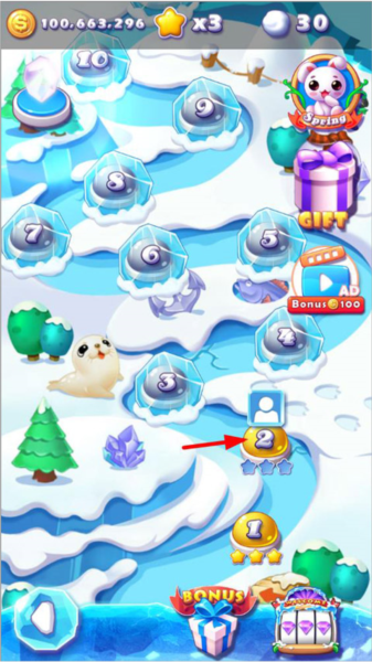 1、玩家打开冰雪消消乐icecrush游戏,进入游戏主页面,玩家可签到领奖励,点击关卡开始闯关;