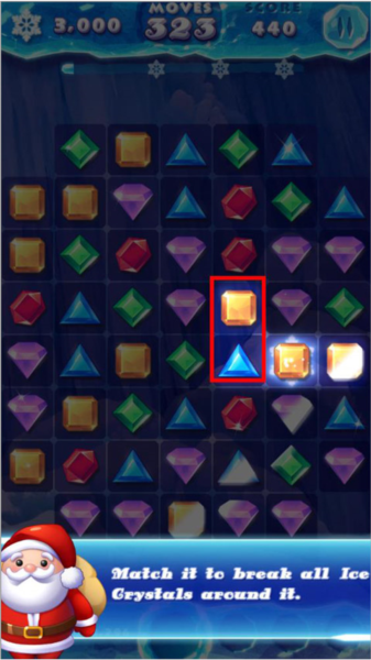 2、玩家在游戏中根据下方提示,切换并匹配3个或更多冰晶,连击以达到消除目标;