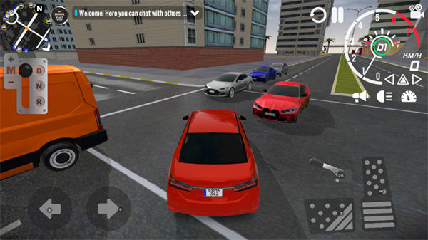 6、车辆的转向由屏幕左下方的方向键控制,屏幕右下方可以控制车辆的油门、刹车、手刹,并且游戏中还可以实现车辆的喇叭、左右转向灯等等共功能。