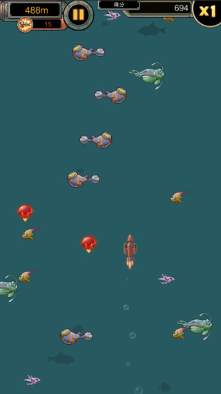 2、第二个过程:水雷上浮,上浮过程中你所击杀的鱼类都将是你所收集的图鉴,所以游戏非常考验你的躲避灵敏力。