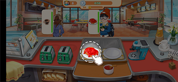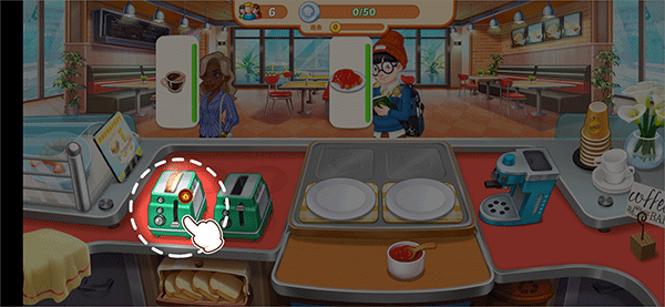 1、进入游戏后,会有客人来进行购买食物,你需要按照客人的需求完成美食的制作,例如客人需要一个番茄酱的面包