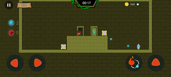 4、除了道具之外,该游戏还提供了很多种类型的机关措施,例如火娃娃想要到达那扇传送门的话需要冰娃娃去按照机关按钮才能将道具门打开,方能通关。