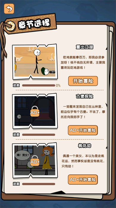打开游戏界面点击开始冒险就快要直接进入关卡里面,通过当前的剧情去进行挑选正确的选项去闯关挑战。