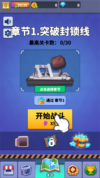 2、游戏内的关卡众多,点击屏幕中的开始游戏即可进入第一章节,突破封锁线,进入僵尸城,通过高速公路登超多的章节自由选择;