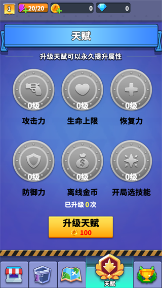 3、玩家还可以使用金币升级游戏内的天赋,升级天赋可以永久的提升角色的属性;