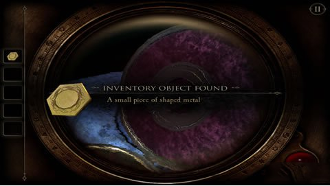 8、把我们刚弄到的完整的眼镜带上,对着这个圆盒子盖看上去,我们会发现有一个红色的指纹,这是我们点击指纹处。把手按倒红色指纹上去,这时我们会发现中间的小圆块会打开,我们会得到一个六边形铜片。
