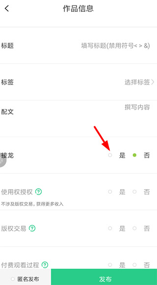 3、在编辑提交信息的时候,用户就能够选择将作品设置“接龙”游戏,不过加入接龙游戏就相当于放弃了授权哦!