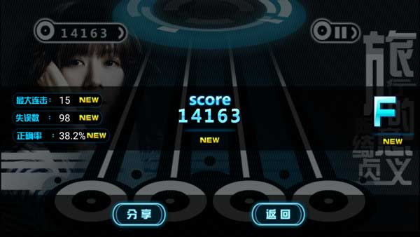 2、游戏开始时会有三秒钟的准备时间,玩家需要通过四根手指来将滑动出来的音符进行点击,成功点击到之后左上方则会显示分数,点击到越多分数也就越高。