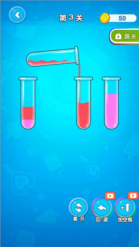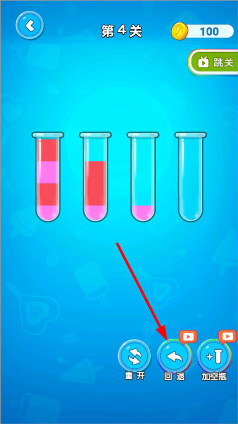 3、如果不小心将玻璃瓶里面的水倒错了,千万不要慌,点击下方的回退即可返回,还可以点重开按钮重新开始游戏。