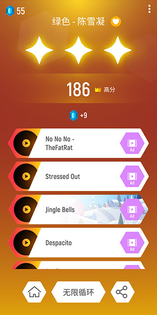 5、挑战成功后会显示玩家的得分以及奖励情况,这时可以选择无限循环该歌曲或者更换其他歌曲。