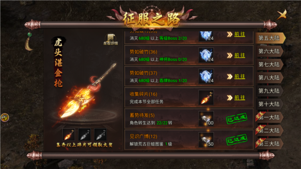 完成征服之路派发的任务。每个大陆包含三个阶段性目标,每完成一阶段可解锁一个神将/神兵碎片,集齐三个碎片为完成,随着大陆推进可解锁怪物图鉴与提升转生等级。