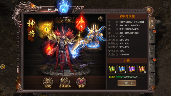 游戏核心的虎卫神兵系统需消耗经验书或战魂升级升星,所有神将无论出站与否都可叠加属性加成给主角,出站神将可以协同战斗,收集专属神兵可激活神将技能——在出站战斗时释放技能;收集美人可机会神将联姻系统,提升神将属性以及解锁新效果。