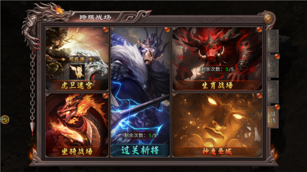 点击界面右上方战场图标,可展开包含六大功能的跨服战场界面:虎卫迷宫、坐骑战场、过关斩将、生肖战场、神魔圣域,挑战可获得战场道具提升战力。
