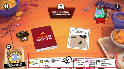 4、然后玩家抓一张牌以结束回合。如果是爆炸小猫,他们就出局了(除非他们有方便的化解卡)。
