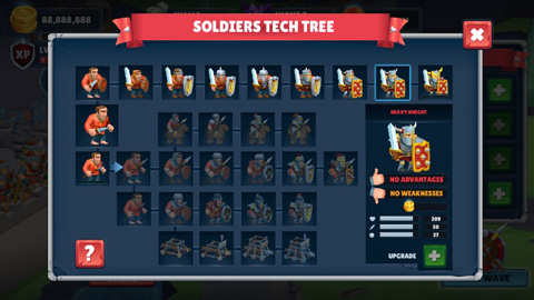 第二用作改进兵种方向,兵种的选择有很多,比如骑兵、盾兵、剑士以及攻城车。