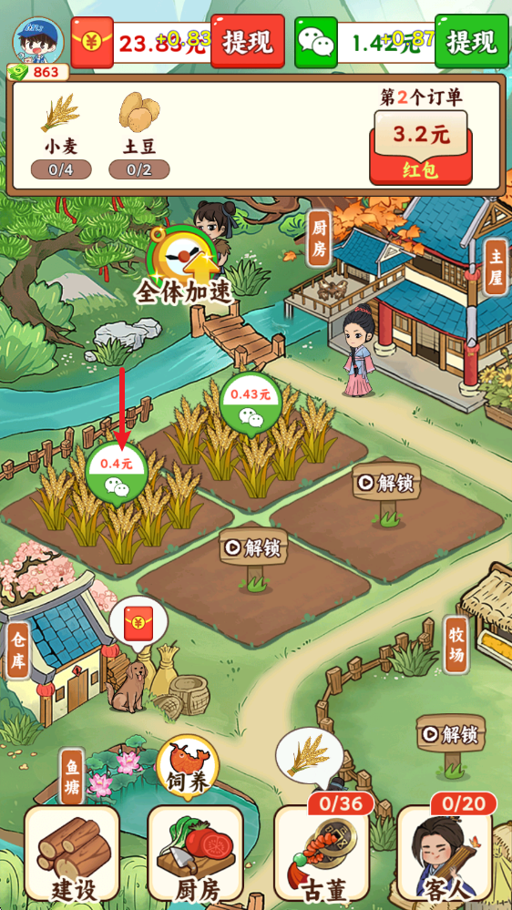 1、游戏中,我们点击最上方的订单即可查看种植目标,随后点击下方空地开始种植。