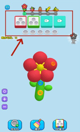 1、开启关卡后,我们在下方就能看到一个由各色毛线所组成的物品了,点击毛线即可将它放入对应颜色的盒子中。