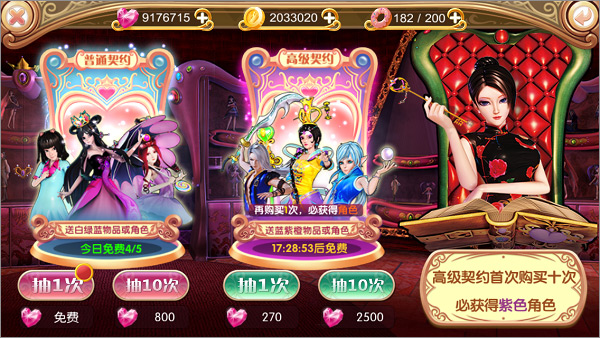 点击主界面右侧【契约】按钮即可进入神奇的契约界面,通过契约可以获得角色、家私、材料等道具,分为普通与高级模式,每个模式分别有抽一次与抽十次的选择,皆需消耗钻石。