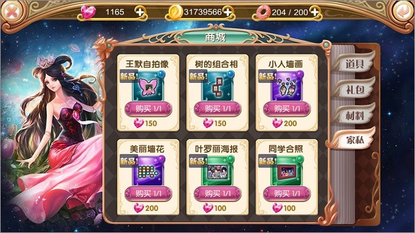 点击主界面左侧【商城】按钮进入商店界面,商店为道具、礼包、材料、家私四类。