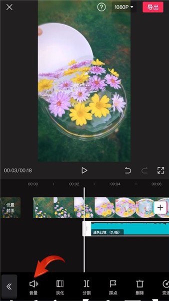 为视频添加一段音乐后,点击下方音频条位置,再点击底部【音量】按钮,此时就可以调节音乐大小了。