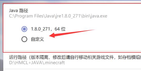 6、随后展开下方“java路径”,点击“自定义”(如果上面的java路径是正确的就不需要修改)