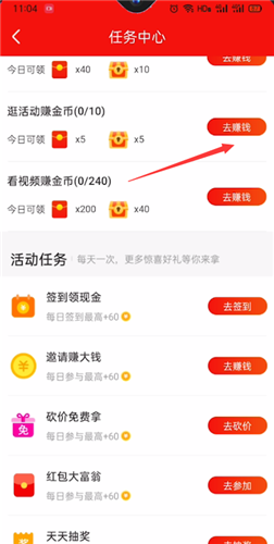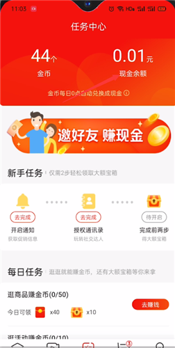 点击我的,点击做任务赚金币,下面有很多任务,点击去赚钱,按照他的提示完成任务,就可以点击红包领取金币,金币会在每天的零点兑换成一定的余额,可以在规则允许下提现为京东红包。
