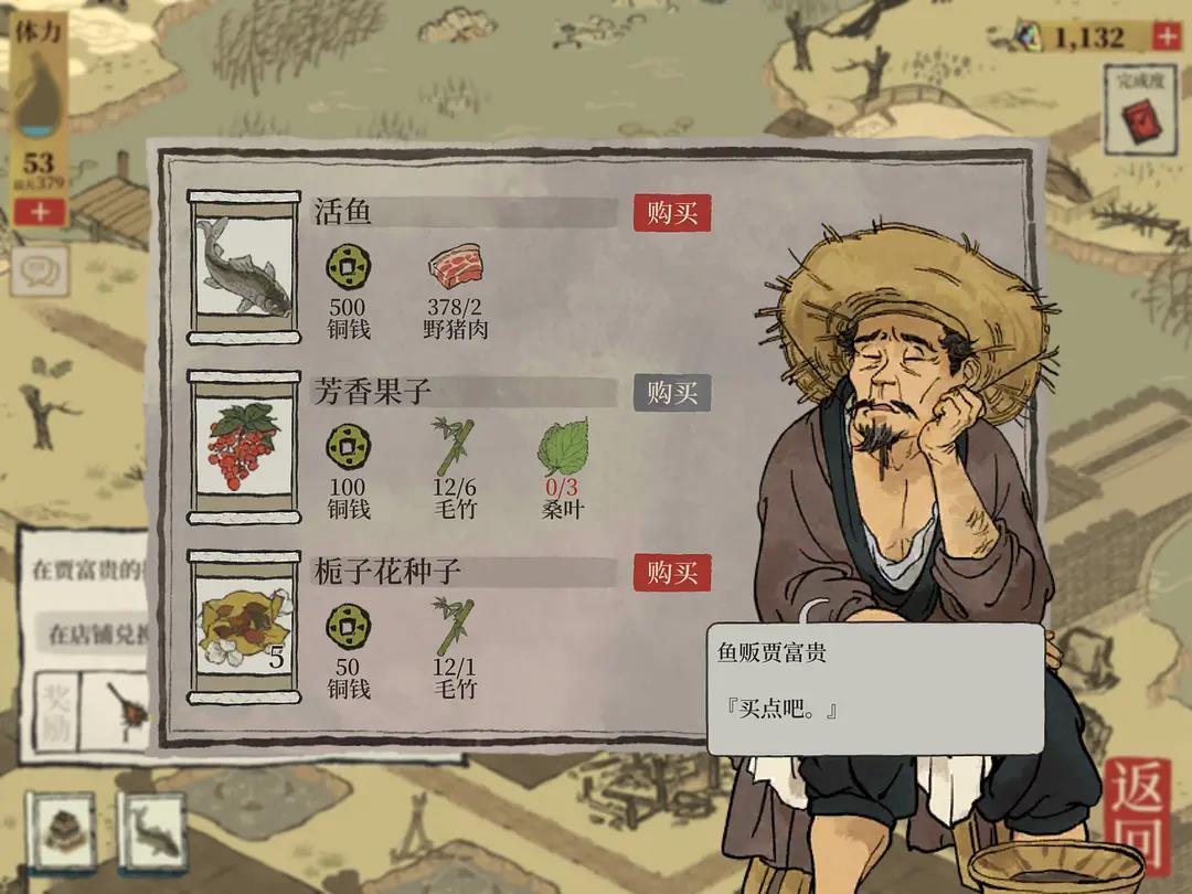 2、这位鱼摊贩富贵,除了出售栀子花,还出售活鱼、芳香果子等道具。