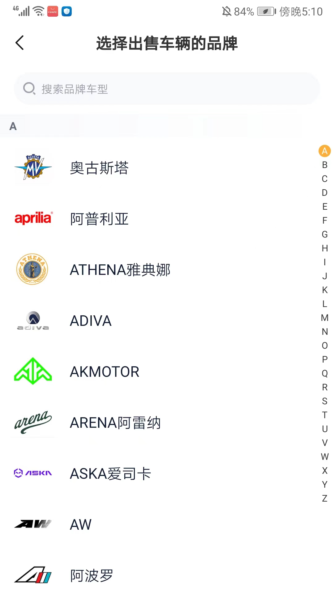 3、滑动屏幕可以浏览并选择出售车辆的品牌,可以在上方搜索框搜索相应的品牌。