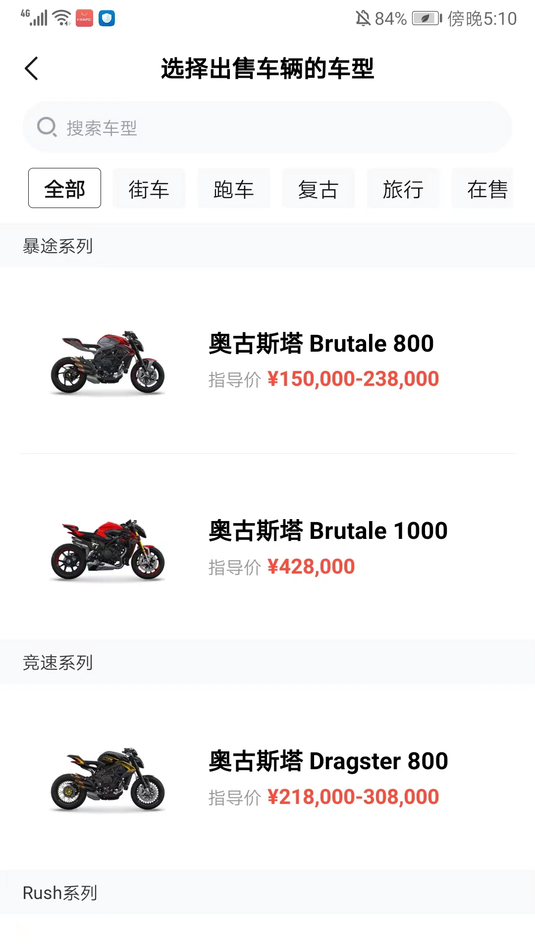 4、选择出售车辆的车型,包括街车、跑车、复古、旅行、在售等分类,也可以进行搜索。