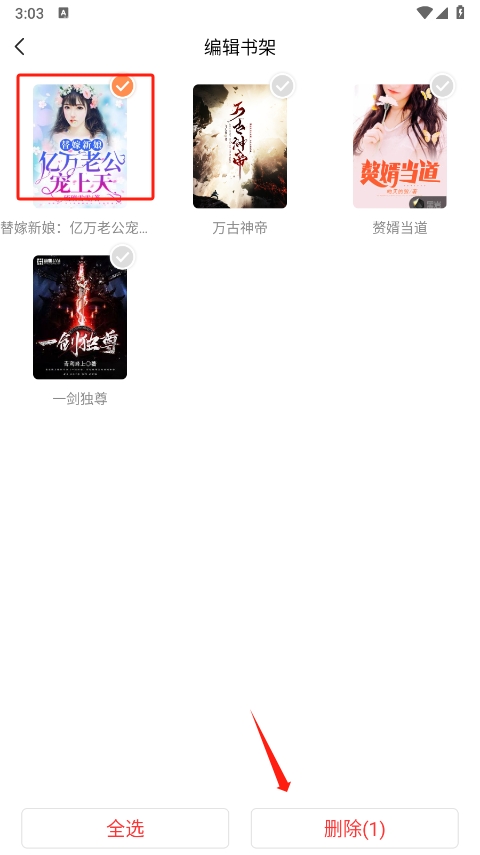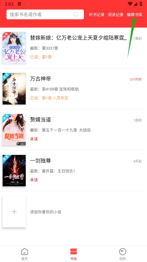 1、打开软件,进入到书架界面点击右上角编辑书架。
